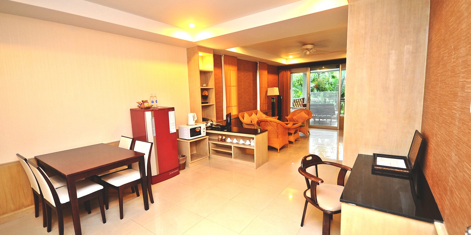 These suite offer a large private balcony and a comfortable living area where family and friends can gather. Relax on the sofa bed and watch TV, prepare refreshments, and enjoy meals at the dining corner, which includes a refrigerator. These suites are decorated in a contemporary style with wooden furnishings and Thai fabrics, adding a touch of local charm.