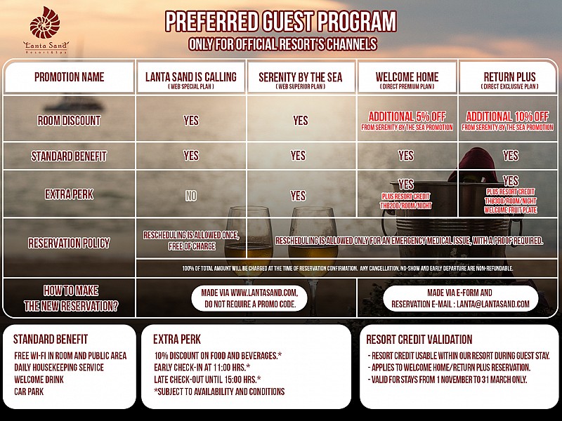 At Lanta Sand Resort & Spa, we believe every stay should be extraordinary. That’s why we’re delighted to introduce our Preferred Guest Program (PGP) — a thoughtfully designed membership that elevates your vacation experience to unparalleled heights.